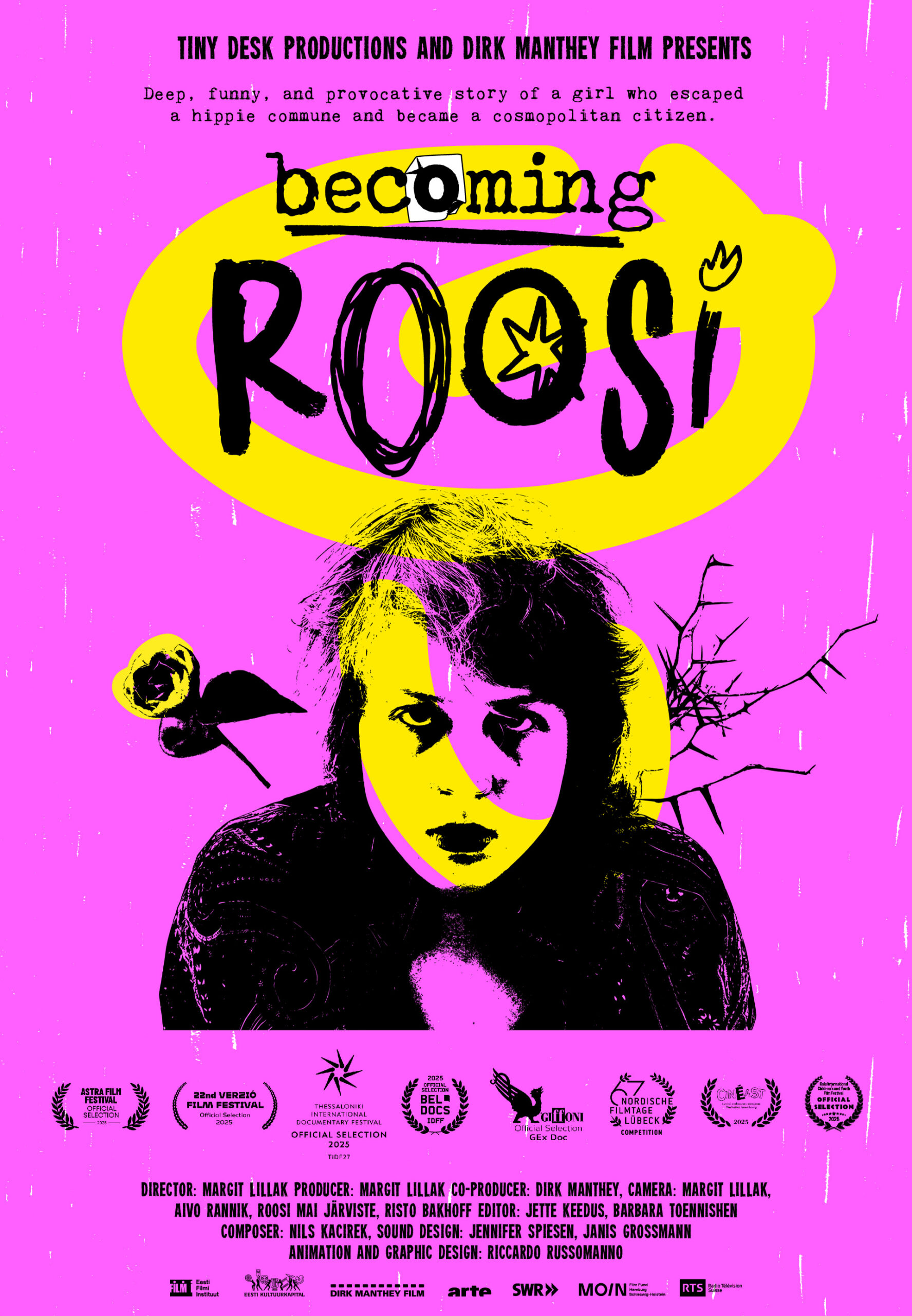 Tiny Desk Productions is an independent production company founded in 2022 by Margit Lillak. The first feature length documentary in production is “Becoming Roosi” in collaboration with German Dirk Manthey films and SWR/ARTE. The founder Margit Lillak has directed and co-produced 2 feature length and 3 short documentaries.